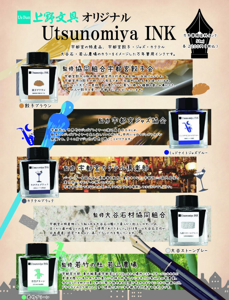■宇都宮の特産品、宇都宮餃子・ジャズ・カクテル・大谷石・若山農場のカラーをイメージした万年筆用インクです。