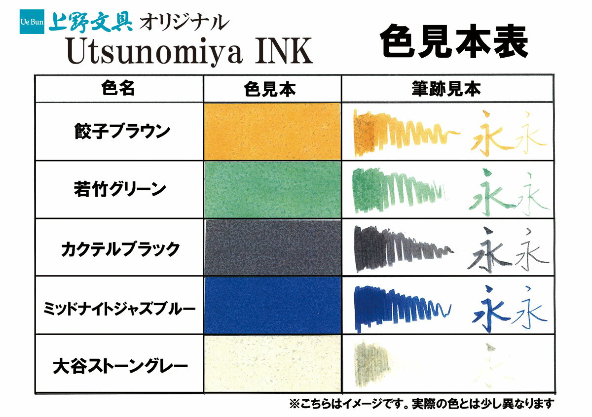 【メーカー】上野文具オリジナル 【商品名】宇都宮インク Utsunomiya INK 【カラー】餃子ブラウン ミッドナイトジャズブルー カクテルブラック 大谷ストーングレー 若竹グリーン 【内容量】50ml