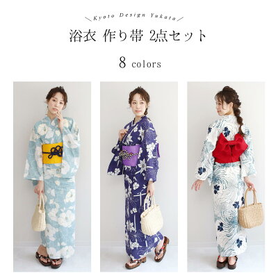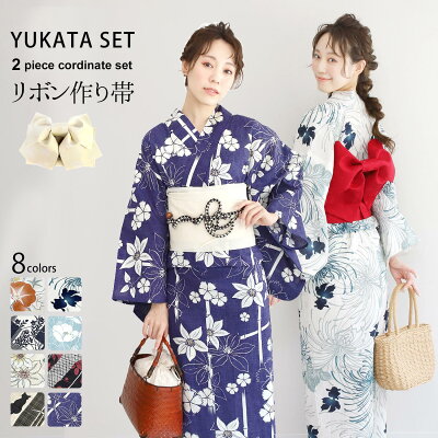 作り帯 リボン型 浴衣 2点セット レディース浴衣 帯 全8柄 Fサイズ レトロモダン ( 白 ホワイト ベージュ 紺 ネイビー あさがお 乱菊 金魚 市松 撫子 椿 ハイビスカス 矢絣 ねこ 150cm 160cm レディース浴衣 婦人浴衣 女性 yukata ゆかた 婦人 寝巻き 寝間着 部屋着 )