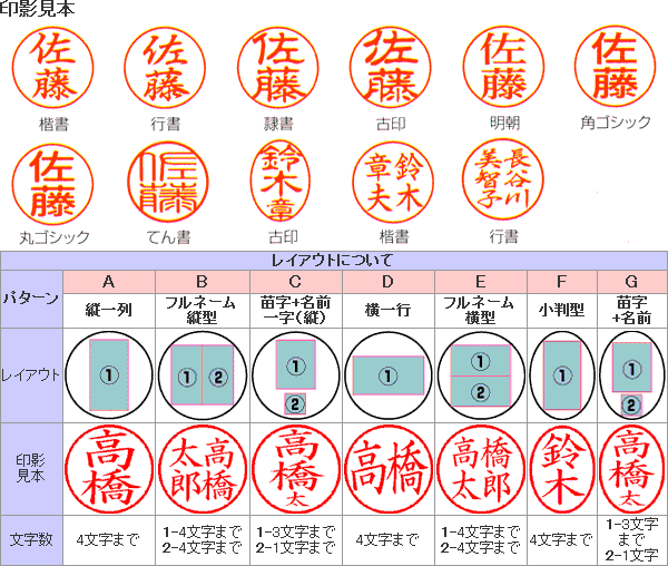 印面サイズ:9ミリ書体:8書体【楷書、行書、隷書、古印、明朝、角ゴシック、丸ゴシック、篆(てん)書】レイアウト:7パターン(丸型5パターン、小判型2パターン)よりお選びいただけます。