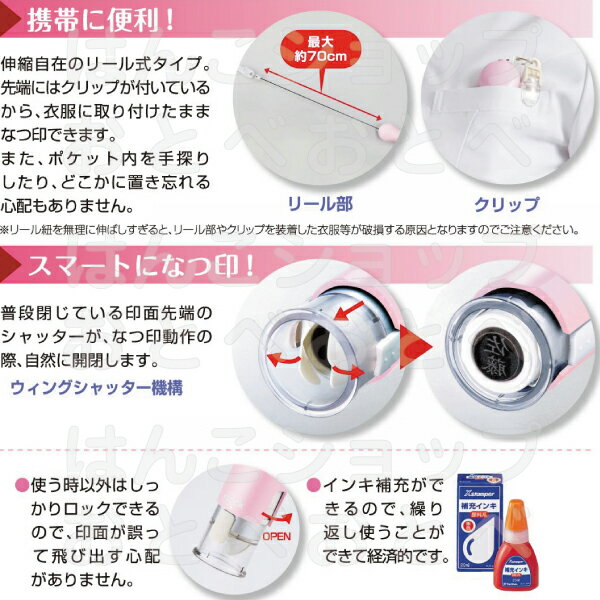 伸縮自在のリール式で、先端にはクリップがついているので衣服に付けたまま、片手で捺印ができます。