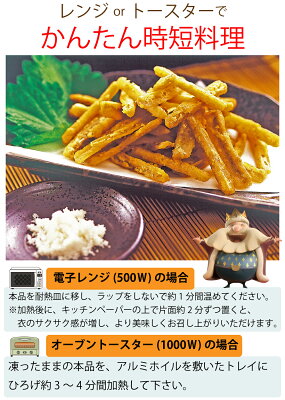 商品内容 ごぼうの甘辛揚げ 230g ごぼう:国産 賞味期限 製造日より1年[要冷凍] 調理方法 ●電子レンジ(500W)の場合 凍ったままの本品100gを耐熱皿に移し、ラップをしないで約1分間温めてください ※電子レンジ加熱後に、キッチンペーパーの上で片面約2分ずつ置いておくと、衣のサクサク感が増し、より美味しくお召し上がりいただけます。