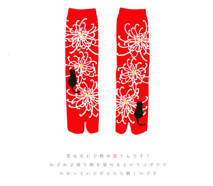 靴下 和柄 足袋 ソックスレディース 女性 23cm〜25cm フリーサイズ クルー丈 糸菊と黒猫 猫 菊 花 赤 白 黄色 黒 足袋靴下 新品 未使用 粋 個性的 かっこいい 可愛い ネコポス OK 和装 着物 No.10-0343